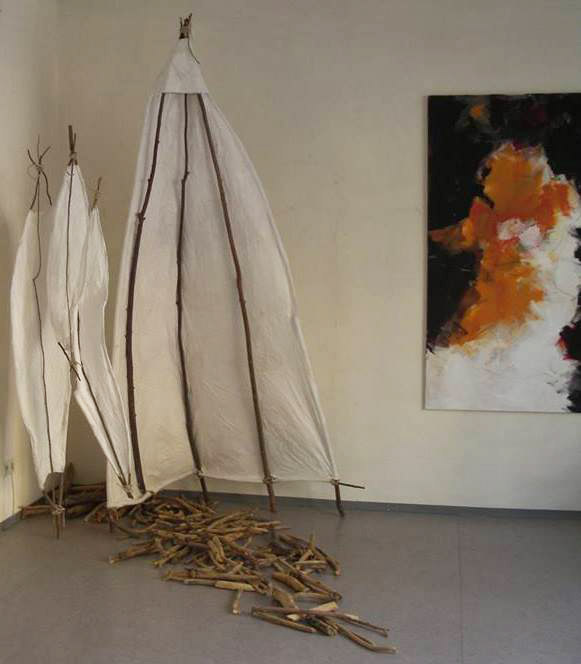 Man fühlt sich an steinzeitliche Wohnstätten erinnert - provisorische Vorläufer des Hauses, wie es als unsicheres, mit seiner Farbumgebung verschmelzendes Zeichen ersehnter Konstanz auf den großen Acrylbildern der Künstlerin immer wieder in Frage gestellt wird. Nein, die festeste Wohnstatt hält dem Zugriff der Zeit nicht stand. Das Signum des rechten Umgangs mit ihr scheint das Segel zu sein, das sich als "Luftschiff" dem Sog der Zeit leichthin anvertraut.